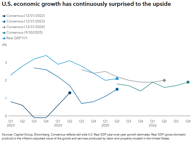 Still, there are concerns borrowing costs may not decline to levels that rekindle spending. After all, the Fed cut interest rates in September 2024, only to see the benchmark 10-year U.S. Treasury, which underpins borrowing costs, rise instead. The culprit? A string of unexpectedly strong economic data prompted investors to recalibrate policy expectations, pushing rates higher. So far this year, the 10-year Treasury has declined over half a point to 4.13% on October 8, from a level of 4.79% in January. A more amiable Fed, particularly if the administration has more sway with rate setters, could explore unconventional tools to suppress long-term yields, says Damien McCann, portfolio manager for CGMS — Capital Group U.S. Multi-Sector Income ETF and American Funds® Multi-Sector Income Fund. “It’s not a prediction, but a possibility worth considering.”