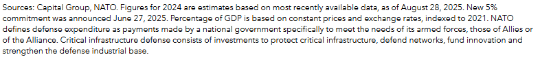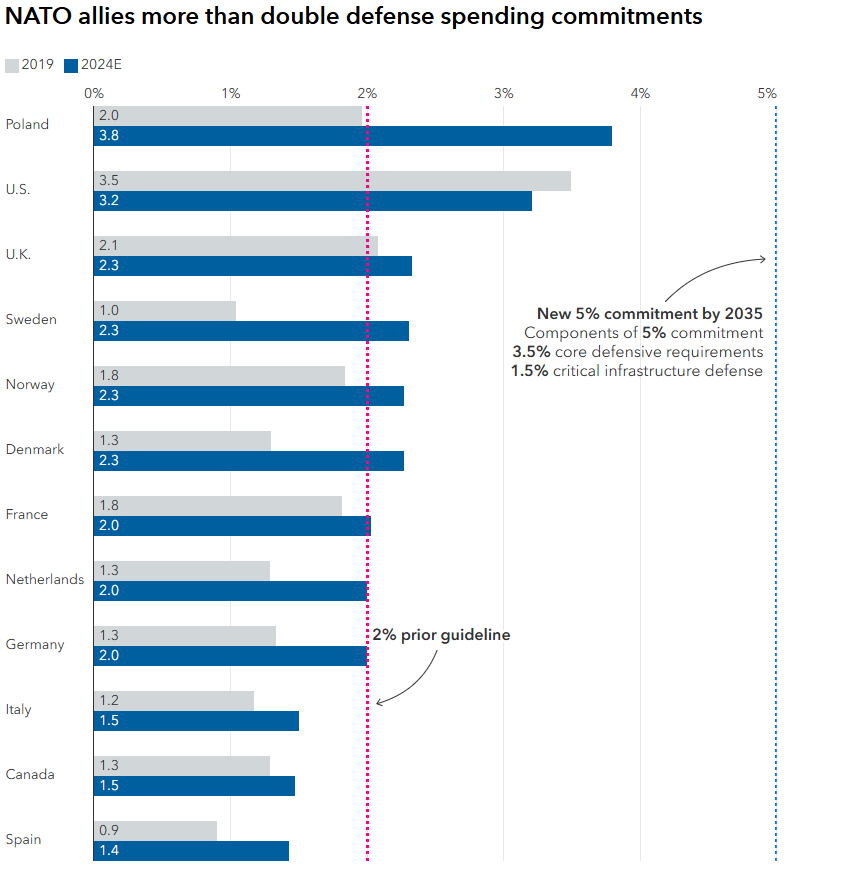 As NATO partners boost defense budgets, demand for products across a range of industries should jump, according to Frank. In June, NATO allies committed to increasing defense spending from 2% to 5% of GDP by 2035 — a dramatic shift that’s reflective of mounting geopolitical tensions as tariffs threaten supply chains and strain alliances. Germany, in particular, has taken the lead. It previously disclosed aggressive fiscal stimulus focused primarily on defense and infrastructure.