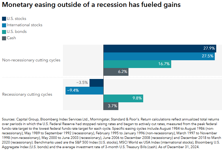 The Federal Reserve’s latest rate cut arrived at a moment of economic softness — namely sluggish job growth. Officials guided additional cuts through 2028, signifying a dovish stance. Rate cuts usually lead to higher company spending and hiring, and more sales of big-ticket items such as cars and homes. “There’s a long list of companies waiting for rates to drop, especially those tied to the housing market,” Frank notes. Potential beneficiaries include retailers such as Home Depot, heating and cooling system manufacturers such as Carrier Global and paint companies such as Sherwin-Williams. Markets have rewarded investors when rate cuts happen outside of a recession. On average, the S&P 500 Index returned 27.9%, while the Bloomberg U.S. Aggregate Index returned 16.7%.